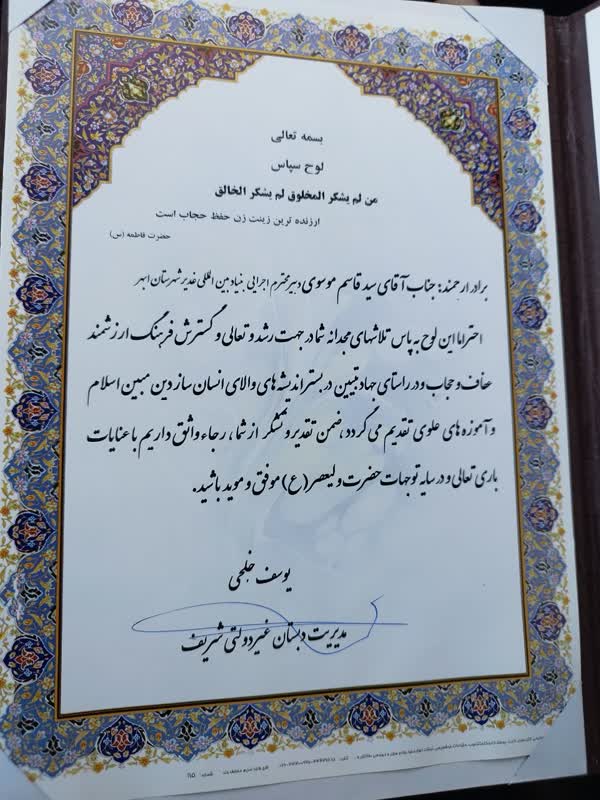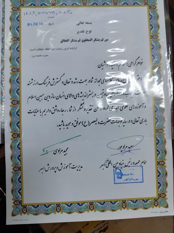 به گزارش خبرنگار امید روشندلان به نقل از روابط عمومی نمایندگی بنیاد بین المللی غدیر در شهرستان ابهر ، عصر روز یکشنبه ۳۰ بهمن ماه ۱۴۰۱ ، و در مراسم اختتامیه ی کارگاه آموزشی جهاد تبیین در موضوع حجاب و عفاف که با مشارکت آموزش و پرورش شهرستان ابهر ، مدرسه ی غیرانتفاعی شریف و بنیاد بین المللی غدیر برای ارتقاء دانش عمومی آموزگاران ، اولیاء و دانش آموزان برگزار شده بود ،