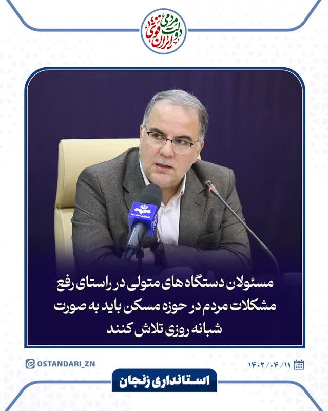استاندار زنجان گفت: مسوولان دستگاه های متولی باید به صورت شباه روزی در راستای رفع مشکلات مردم در حوزه مسکن تلاش کنند تا کمترین دغدغه ذهنی در این خصوص وجود نداشته باشد و رایزنی های لازم نیز برای کاهش معضلات انجام شده است.
