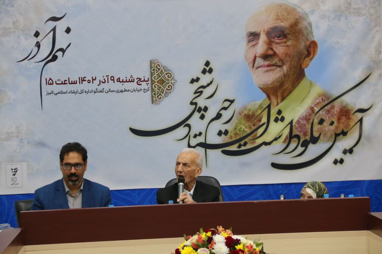 عصر پنجشنبه ۹ آذر ۱۴۰۲ آئین نکوداشت استاد رحیم رشتچی از موسسین دانشگاه زنجان و پایهگذاران شهرک کارمندان در سالن گفتگوی ارشاد اسلامی کرج با حضور اساتید،فرهنگیان،همشهریان و سایر علاقمندان فرهنگ و ادب استانهای تهران،البرز و زنجان با شکوه هرچه تمامتر برگزار گردید.