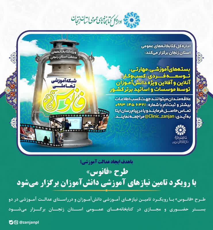 مدیرکل کتابخانه های عمومی استان زنجان، گفت: با اجرای طرح «فانوس» در کتابخانههای عمومی استان زنجان، زیرساختهای آموزشی مدرن و تجهیزات هوشمند برای مناطق کم برخوردار فراهم شده است تا عدالت آموزشی و افزایش اعتماد به نفس دانشآموزان تحقق یابد.
